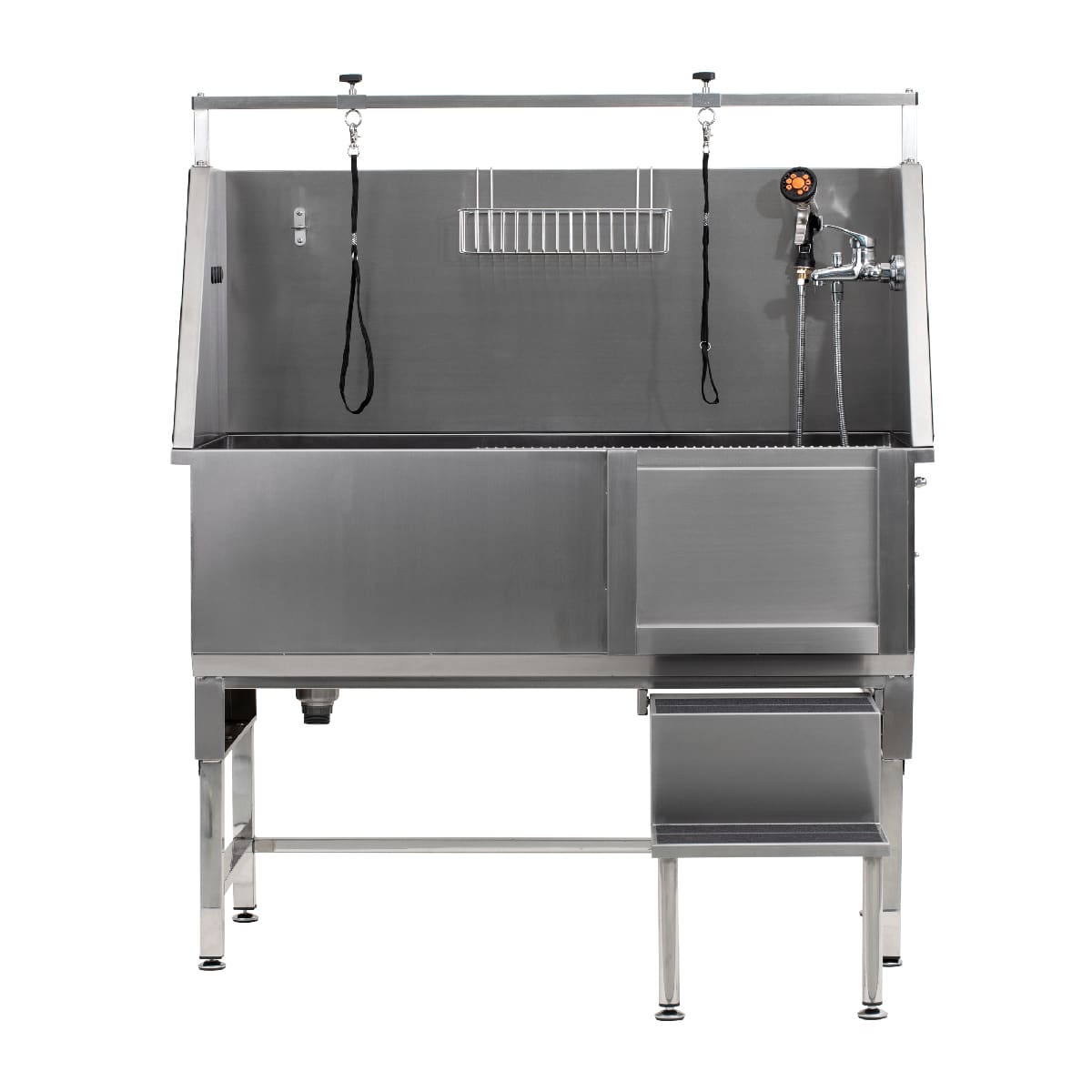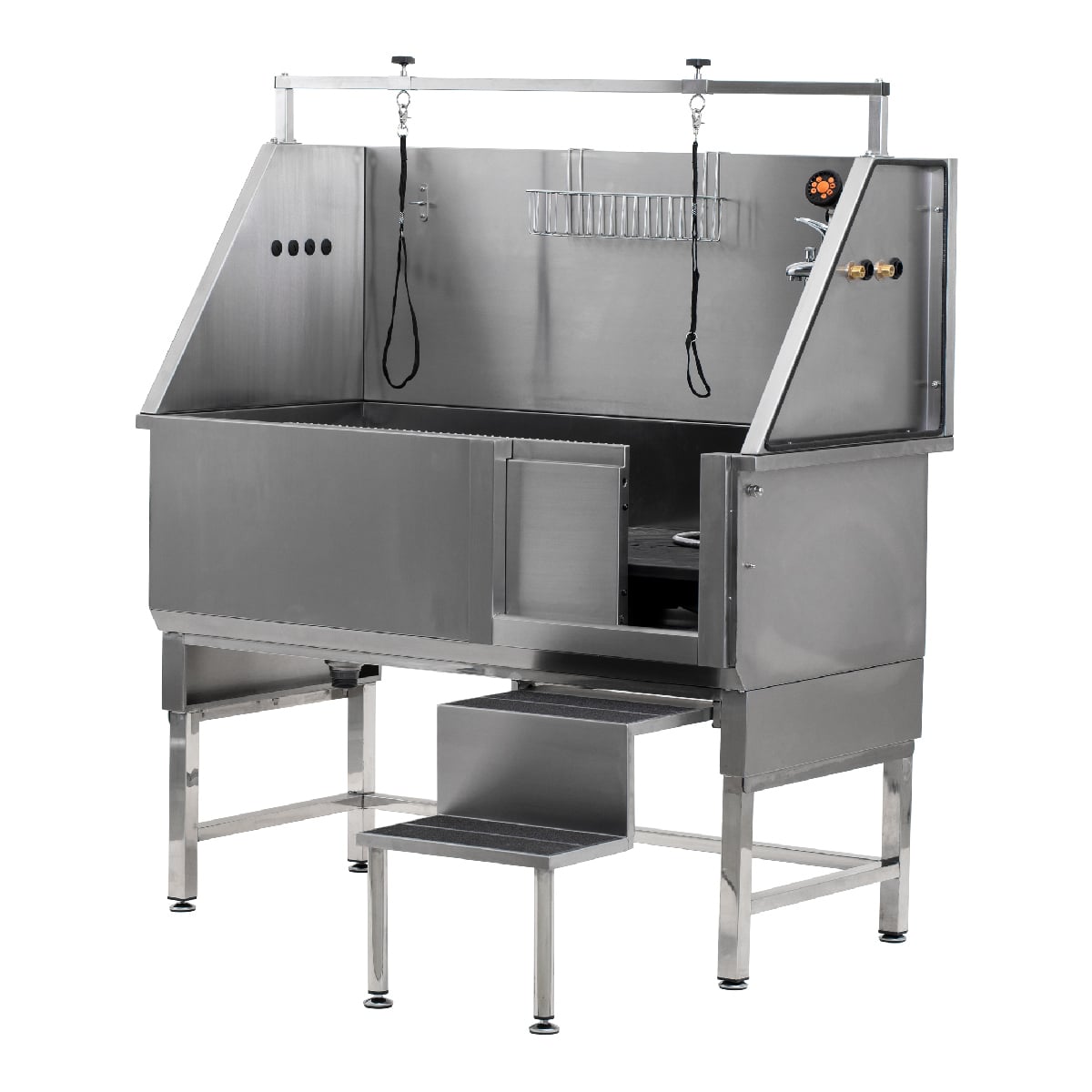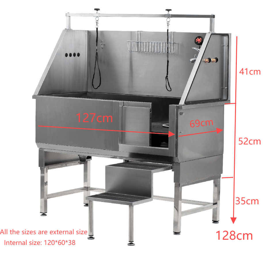 8. Fjölhæf og notendavæn: Baðkarið er 128 cm x 67 cm  og 38 cm djúpt, sem rúmar fjölbreytt úrval gæludýra. Fjarlægjanlega geymslukarfan úr ryðfríu stáli heldur litlum verkfærum og fylgihlutum við höndina. Fyrir frístandandi útgáfuna gerir útdraganlegar tröppur auðvelda notkun með einum fæti, sem frelsar hendurnar til að meðhöndla dýr og rennihurðina samtímis.