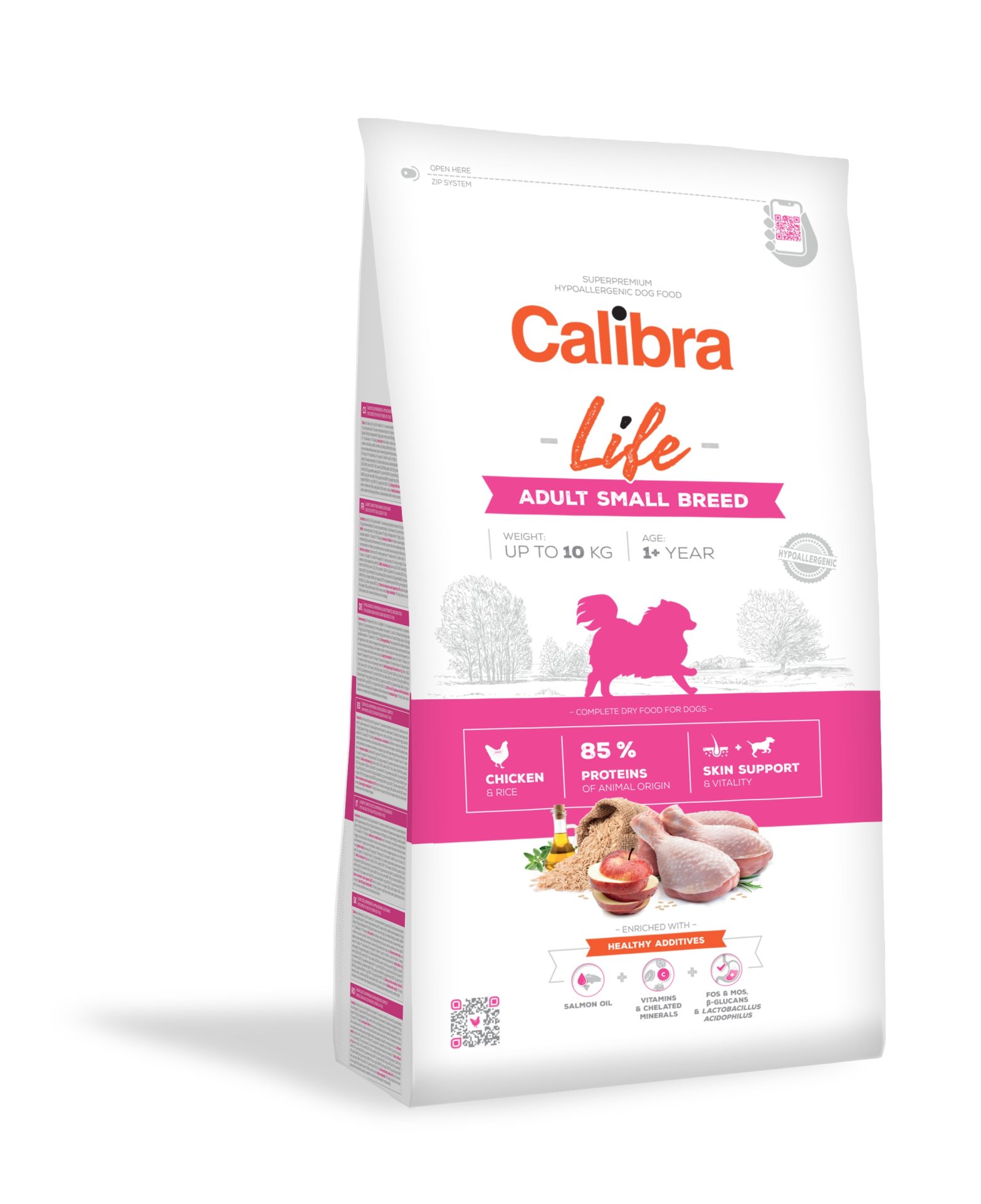 Calibra Dog Life Adult Small Breed Chicken – Uppskriftin, gerð með hágæða kjúklingi, inniheldur 85% dýraprótein. Maturinn er auðgaður með laxaolíu til að hugsa um húð og feld. Bætt melting er studd af prebiotics sem, ásamt vítamínum og steinefnum, sjá um heildarorku hundsins.