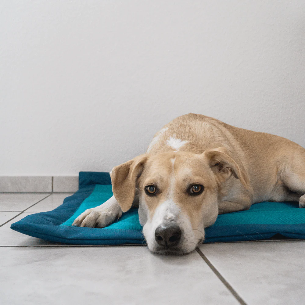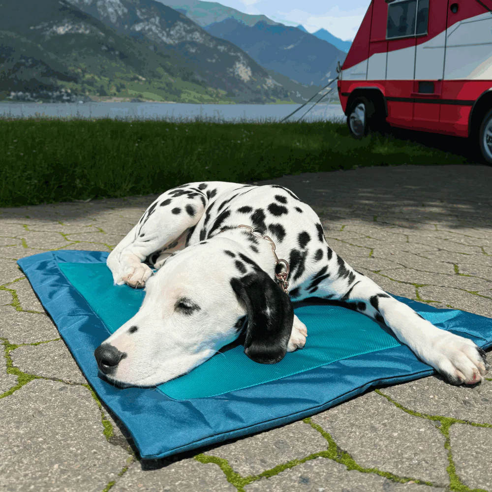 Fullkomið fyrir hundinn þinn! Ferð þú með hundinn þinn á skrifstofuna, í heimsókn til vina eða eruð þið oft úti í náttúrunni saman? Þá er nýja hundamottan okkar í töff dökkblágrænum lit nákvæmlega málið fyrir þig. Hún er rispuþolin, vatns- og óhreinindafráhrindandi og því er auðvelt að leggja hana á rakt gras og þurrka hana eftirá. Hágæða merkið endurspeglast í myrkrinu og létt fylling gerir mottuna að þægilegum stað til að liggja á.