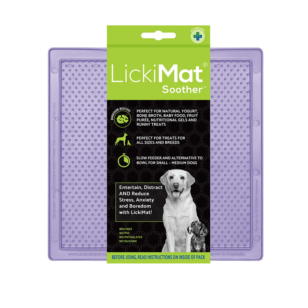LickiMat ® Classic Soother er henntugt fyrir hunda og hvetur til slökunar. Fullkomið fyrir gæludýra nammi, jógúrt, hnetusmjör, álegg, hráfóður, fljótandi fóður, gæludýrafóður. Hæg fóðrun, góður og skemmtileg viðbót við hægfóðurskál. Fáanlegt í ýmsum litum.