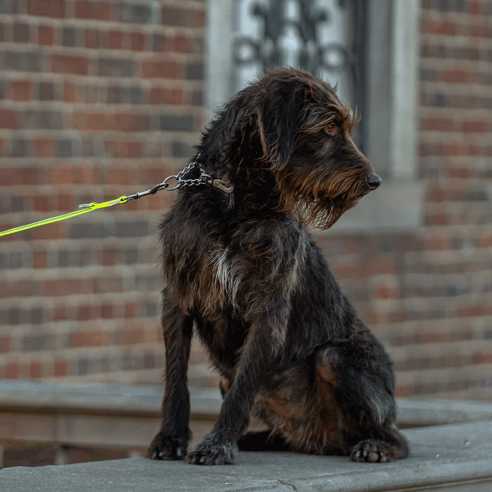 Eins og samsetningarkeðjan hefur ólin hringlaga hlekki og sterkan hring (einnig úr ryðfríu stáli) til að festa tauminn. Innbyggða samsetningarkeðjan auðveldar ásetningu og býður upp á takmarkað grip, sem þýðir að hún uppfyllir allar kröfur um dýravelferðarbúnað fyrir hunda og býður einnig upp á öryggi fyrir hunda sem vilja slíta sér úr ólinni í erfiðum aðstæðum, til dæmis.